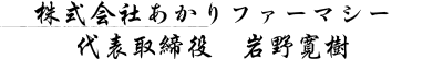 | 店舗 | 〇あかり薬局本店 〒709-0631岡山県岡山市東区東平島922-1 〇あかり薬局平島西店 〒709-0631岡山県岡山市東区東平島1041-1 〇あかり薬局富田店 〒700-0936岡山県岡山市北区富田441-6 〇あかり薬局上南店 〒704-8166岡山県岡山市東区君津320-1 |